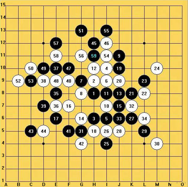 棋都没啥机会,和棋几率较大,最终作风保守的我选择了H10……13手F9正着,幸好对手没走我不熟的I10,26手白棋切断黑棋左半盘与右半盘的连接,黑棋局部不可能杀掉,注定了这盘棋和棋的结果……