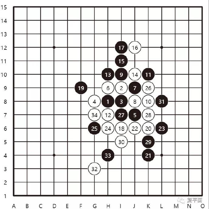 黑11~15连贯的手段,黑棋主动!此处白棋最佳应对仍需探索。如果白棋利用仅有的活二来消耗黑棋显然和这个局面的整体思路有所矛盾,局部单防是比较优先的考虑。白16后黑17-H11牵制或19位单防都是不错的选择,上方始终有稳固而干净的先手,又能迅速压制下方白棋的材料,争取以优势向下方过度,就达成了这个局面的核心战略。但实战17?!局部看似攻势猛烈但实则是脱先的大恶手,白18必胜!此处黑19-J5强防,白20-25之后仍有一些分支需要计算,但实战黑19简直不可理喻,白20后白棋简单必胜。
