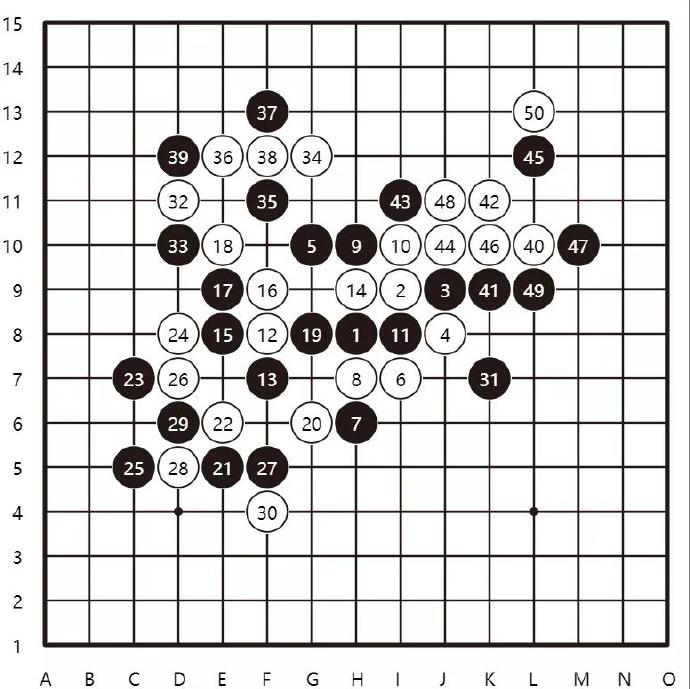 黑7略做变化,此型第一个要点是黑9唯一防(溪月局盘端不同,可单防三三点)!白12手我个人以为不如直接白12-14,后续对比,如黑13-13则不好,以下白14-31!如黑15-J7则白16-41!如黑15-G7则白16-12张弛有度!实战白14重新填入,略微亏损但仍可一战。此时或许黑15-31控制长远来看更好?实战黑15追求直接手段,但白16稳健!以下我计算许久都未能找到突破性的进攻手段,无奈一边尝试性进攻一边保证局面稳定,但白26是富有潜力的防御手段!压力之下我未能找到适当的处理手段,至白30定型,直接黑31-32强硬试探如何?实战黑31后白棋当然直接占据32位,后续围绕优势形状向右上拓展,我在时间压力下节节败退,最终还是输掉了比赛。