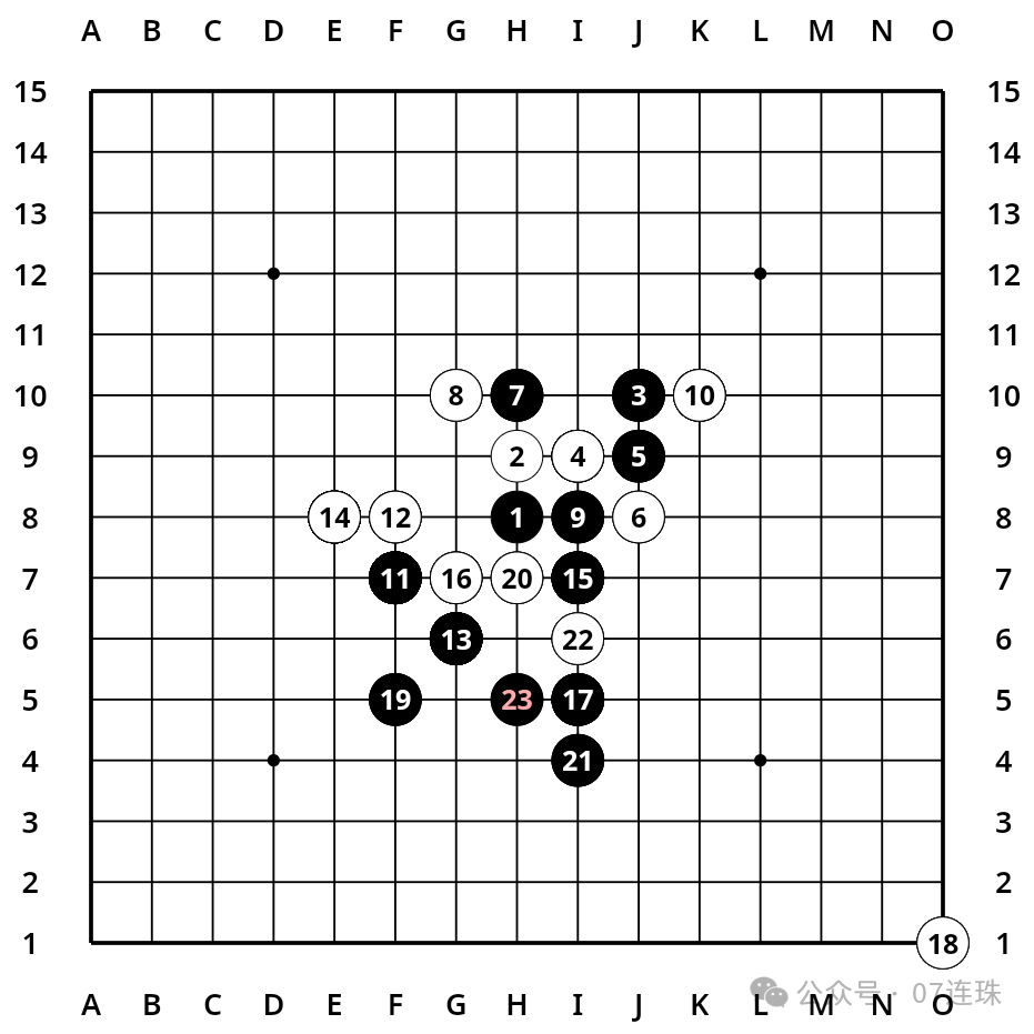 于是我15手直接选择对攻,选择的原因是这个15有连续进攻,至少在没有深度计算下后续进攻还是有可下度的。显然这个防守一般是g7和h7