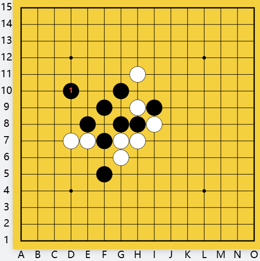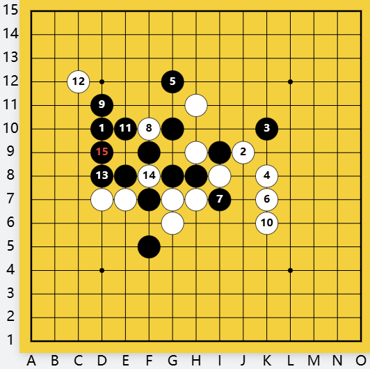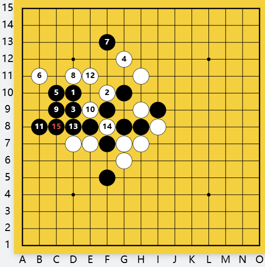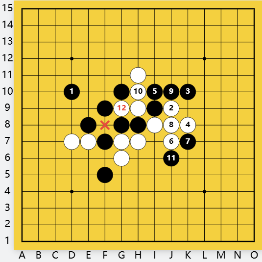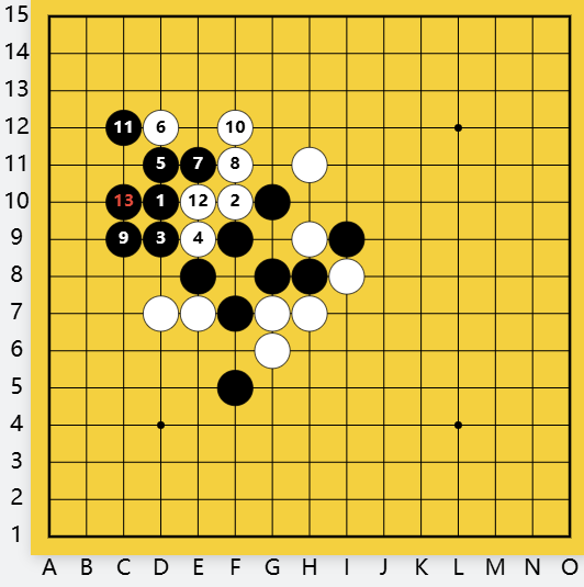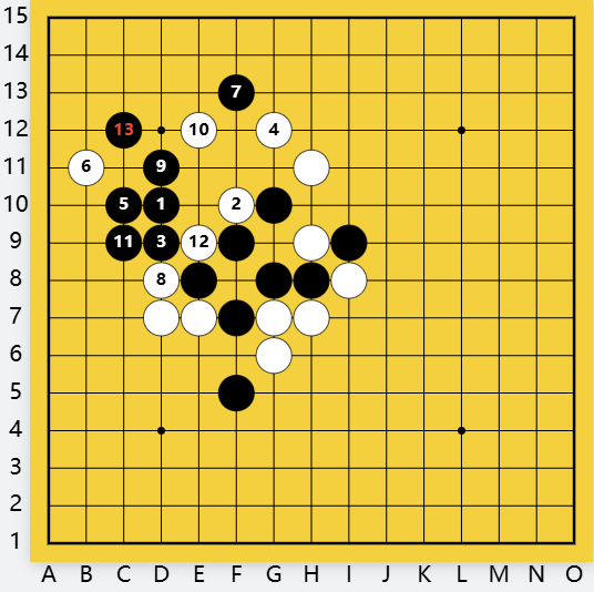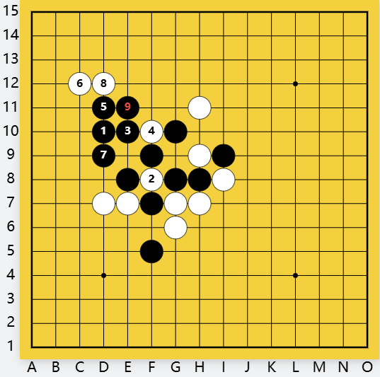 白防守?间挡白活二F10,黑D9做杀,有下一步C12双杀。