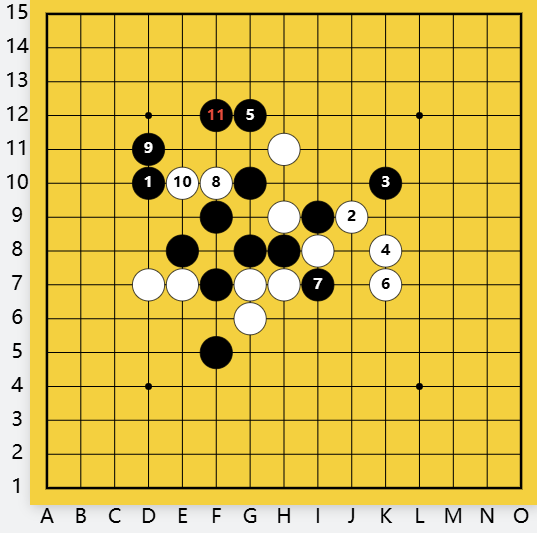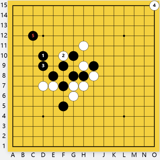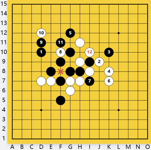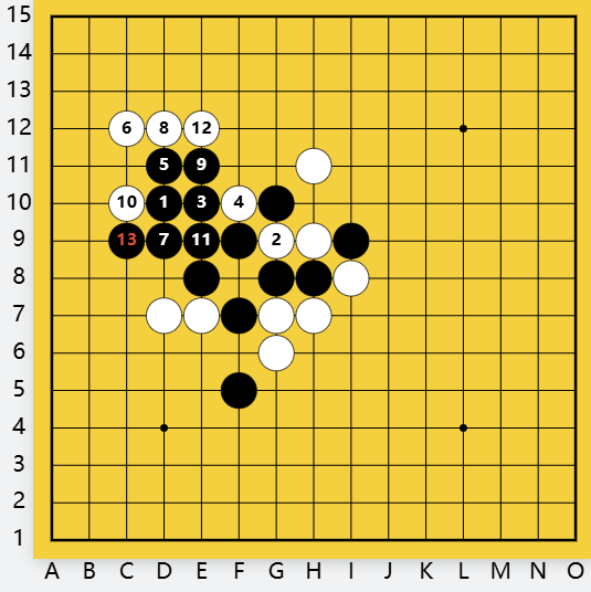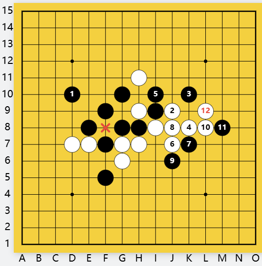 黑右间挡白眠三,为白一直瞄着的双四禁手带来逼住的机会。白还是直活三,黑11挡上挡下一样,白12向下斜活三,直逼黑棋命门双四禁手点。