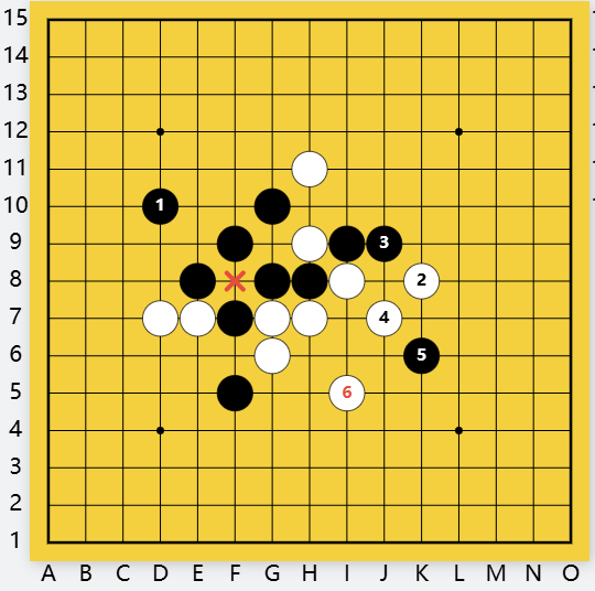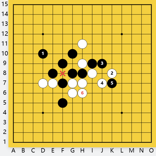 看来白防,不行!瞄着黑双四禁手:H6、D6黑杀法如上。白G9黑只是多冲一步。