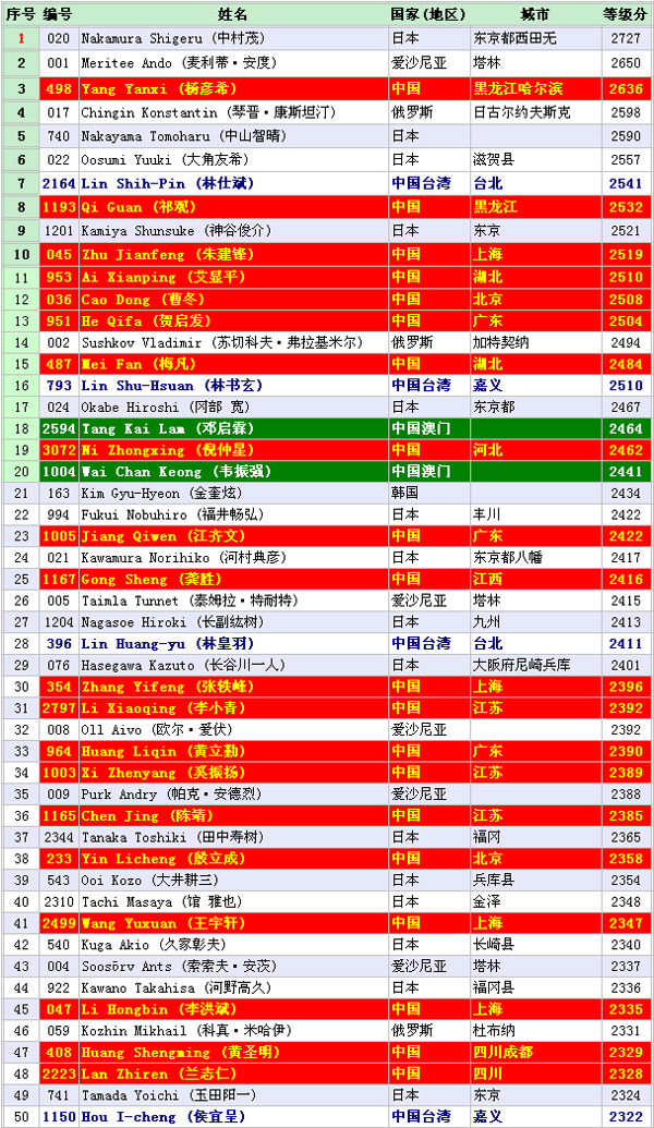 中国杨彦希第三、祁观第八、朱建锋第十、曹冬第十二。 让人不解的是爱沙尼亚麦利蒂安度,多年不参加比赛排名还稳居第二。之中中国的有些棋手从来没有参加过RIF相关比赛或近年也很少参加其他比赛,还榜上有名?对于正式成为RIF会员的中国官方不知如何看?