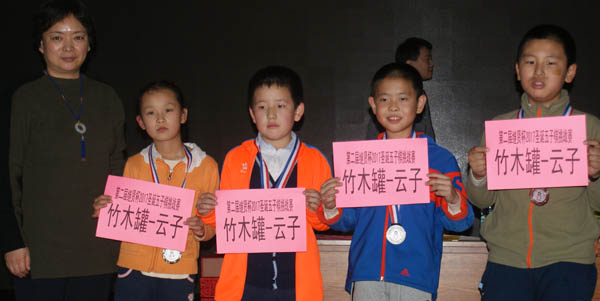 兴趣班组七轮战罢吴雨凡 、周笑妍、杨昊楠摘得个人金、银、铜牌,并分别获得4CM新榧木五子坐标/围棋棋盘、竹木罐+云子、锦盒+仿玉子。周懿文获得个人女子第三名及锦盒+仿玉子的奖励,袁睿宏获得3-4年级个人第二名及锦盒+仿玉子的奖励,王冠钦获希望之星奖及锦盒+仿玉子的奖励。一师附小、宣武师范附属第一小学、北京景山学校远洋分校获得团体前三名,各校三名棋手及授课教师分获4CM新榧木五子坐标/围棋棋盘、竹木罐+云子、锦盒+仿玉子。打工子弟奤夿屯小学十名小棋手受到了每人一套棋具的鼓励。 那威还向各参赛学校赠送了多本自著的《五子棋新手入门》。