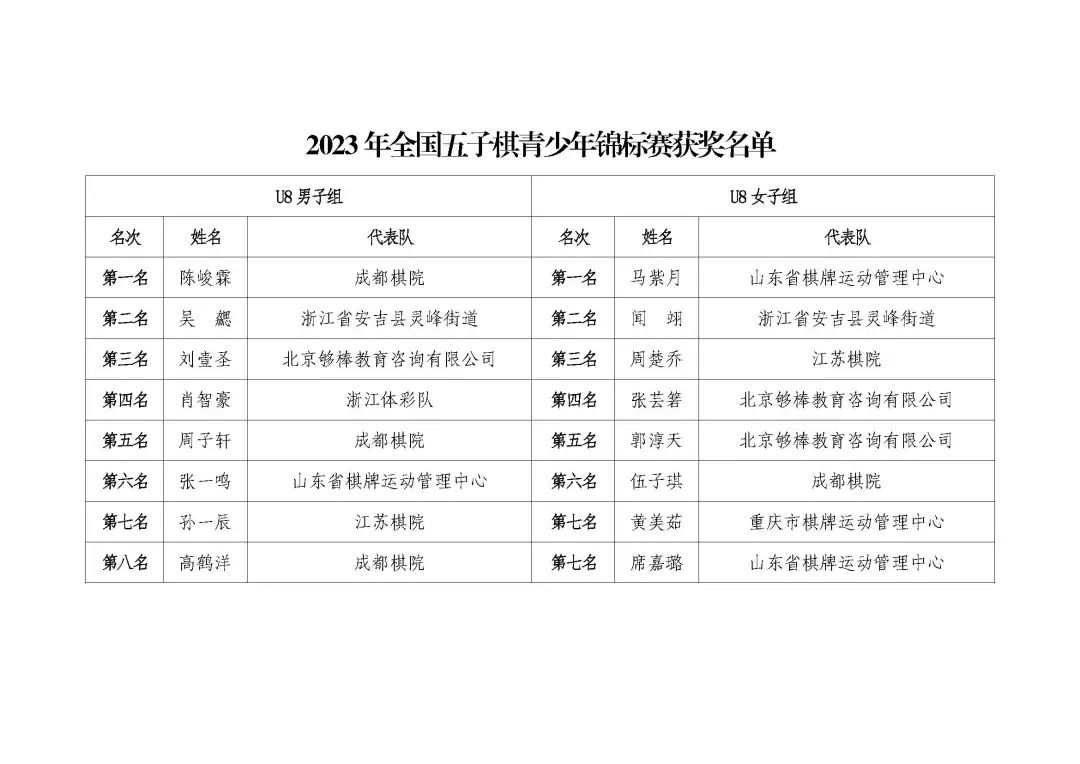 U8组主要面向小学一年级和二年级的学生。虽然小选手们学棋时间不长,但在每轮近2小时的比赛中却下的十分认真。最终,成都棋院的陈峻霖和山东棋牌中心的马紫月分获男子组和女子组冠军。成都棋院和江苏棋院获得混合团体前两名。