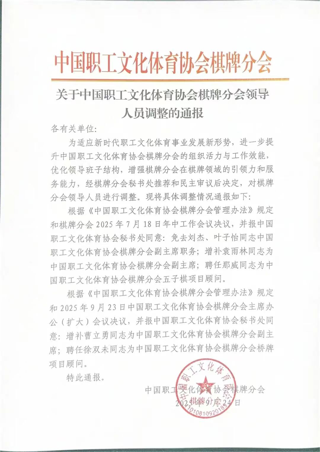 根据《中国职工文化体育协会棋牌分会管理办法》规定和棋牌分会2025年7月18日年中工作会议决议,并报中国职工文化体育协会秘书处同意:免去刘杰、叶子怡同志中国职工文化体育协会棋牌分会副主席职务;增补袁雨林同志为中国职工文化体育协会棋牌分会副主席;聘任那威同志为中国职工文化体育协会棋牌分会五子棋项目顾问。