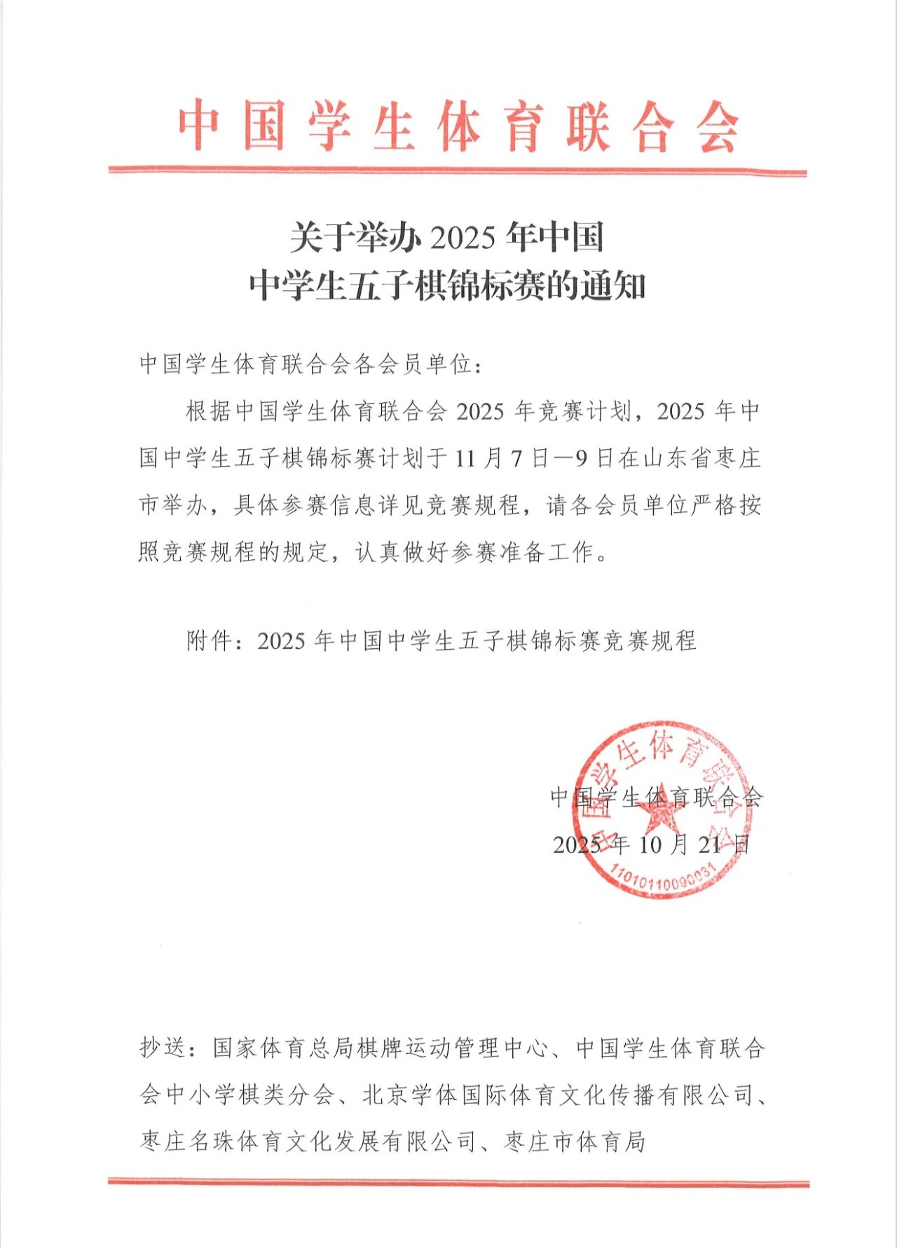 关于举办2025年中国中学生五子棋锦标赛的通知