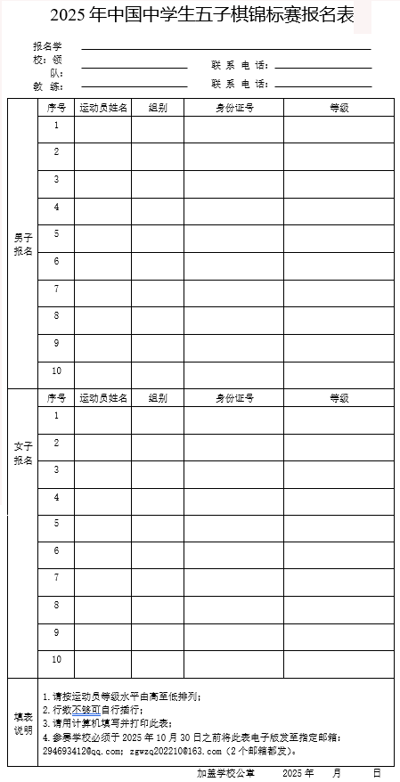 每所学校可报领队1人、教练员1人,运动员人数不限。请参赛学校必须于2025年10月30日前,将报名表(附件1)