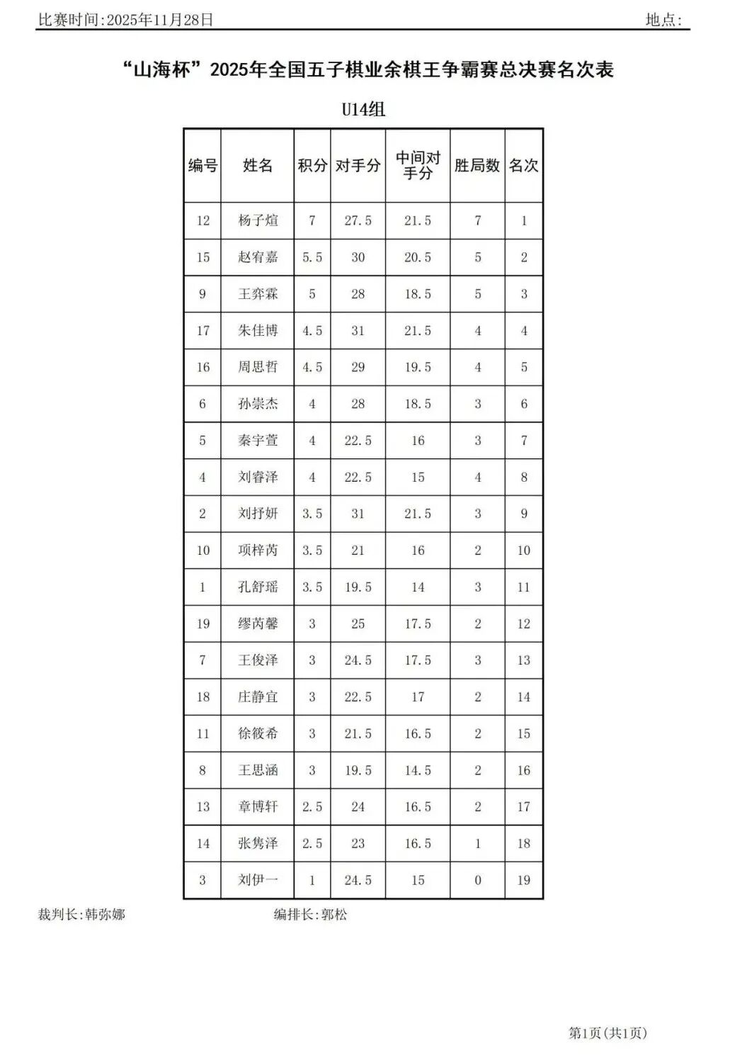 11月30日,U系列赛事率先落幕。在竞争激烈的U14组中,来自浙江台州的杨子煊展现了王者风范,以七战全胜的完美战绩强势夺冠。这位此前已揽获2024年世界青少年五子棋锦标赛超快棋赛冠军、2025“灵峰杯”世界五子棋公开赛U18组亚军等多项荣誉的棋坛新星,再次用实力证明了自己的顶尖竞技水平。赵宥嘉与王弈霖分获该组亚军和季军。
