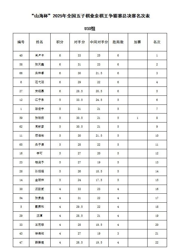 U10组的对决同样扣人心弦,最终分院注册棋手肖卢卡在积分相同的情况下,凭借更高的对手分(33分)成功登顶,以6积分、6胜局的优异成绩夺冠。肖卢卡,这位五子棋界的“未来之星”,今年不仅实现了全国五子棋青少年锦标赛三连冠的壮举,更是将浙江省青少年锦标赛四连冠的荣誉收入囊中。同组的张天鑫、朱梓睿虽同样取得6积分、6胜局,但最终因对手分稍逊,分别位列亚军和季军。