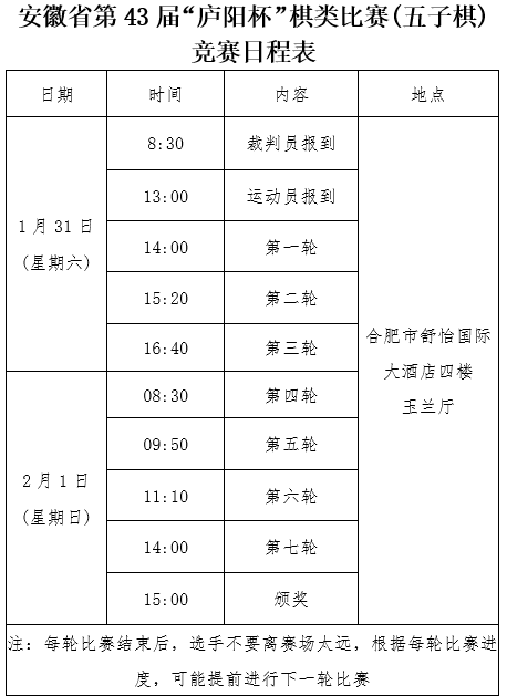 为进一步推动推动我省五子棋项目发展,促进竞技水平提升,定于2026年1月31日-2月1日在合肥市举办安徽省第43届“庐阳杯”棋类比赛(五子棋),请各单位接通知后,积极组织报名并做好参赛工作。
