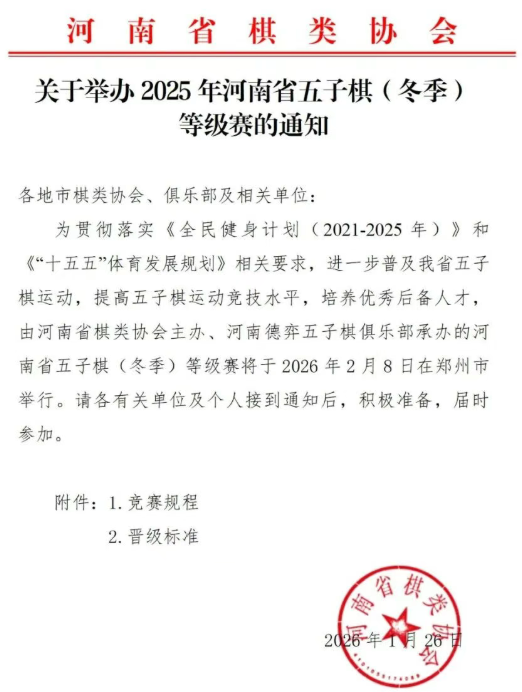 (一)通过"河南省棋类协会"公众号点击"赛事报名",或微信小程序搜索"豫竞平台"完成报名,报名截止时间2026年2月4日23点59分59秒。