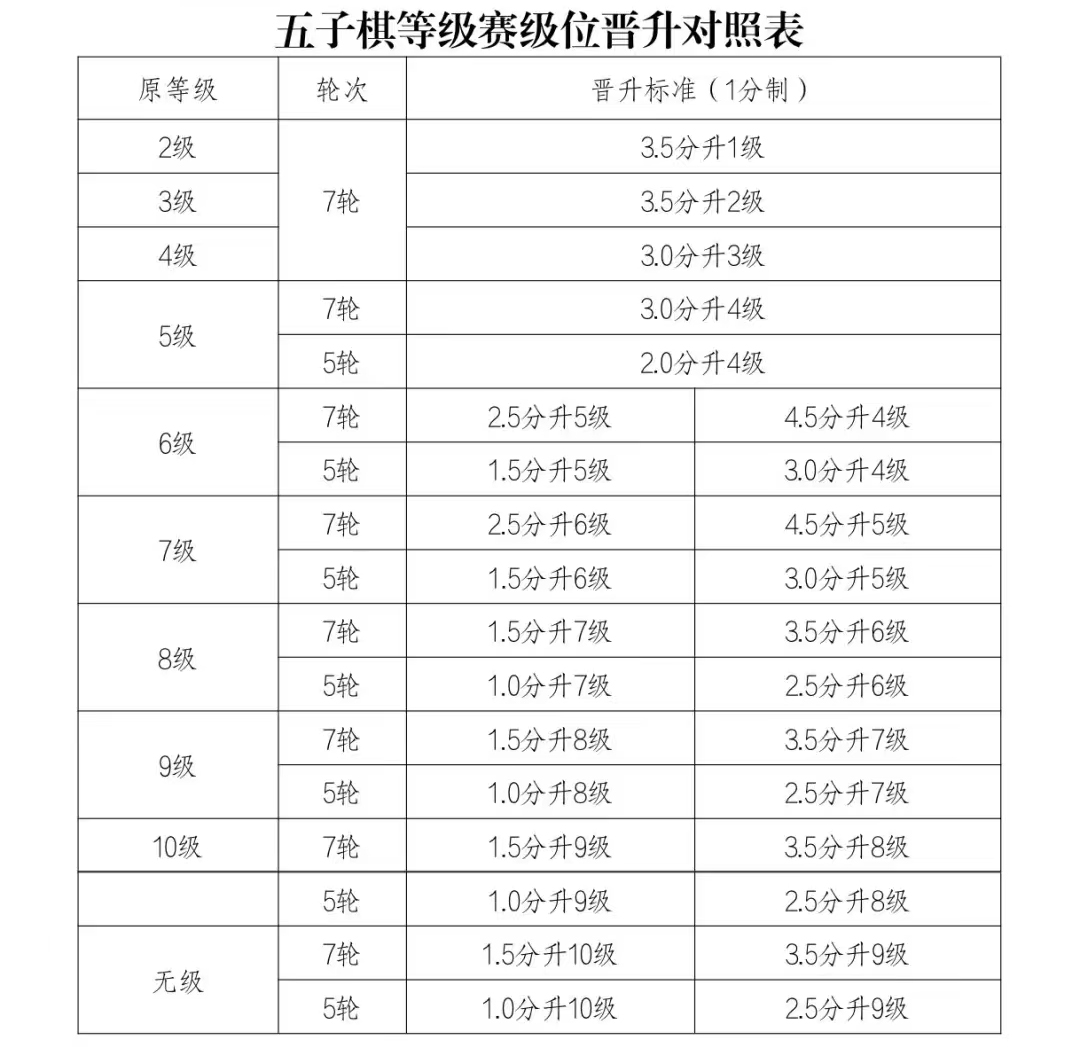 (1)高一级别人数多,低一级别人数少,高一级别棋手升级标准为同级组的标准,低一载别棋手升级标准减少半分。