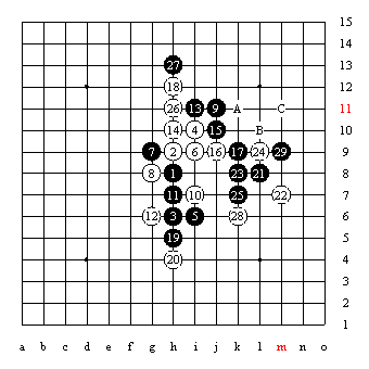 实战,双方按照定式走到第10手后,黑棋对11手进行了选择。常见的黑棋有I8、I11点。但实战黑棋选择了H7这个点。从我对棋局的整体感觉来说,这个点黑棋略微的亏,白棋如果12走在16位对攻,是不错的一种选择,而实战白棋选择防守也是很稳重的一种下法,没有什么不妥。黑棋13做棋,并控制局面,这是一步好棋,白14的应对也很正常。当黑棋15继续做棋的时候,白棋16出现了败招。白棋此时可以有两种下法,第一可以利用自己的四三杀,先抢19位,这样可以阻止住黑棋19-5-23这条线的利用。第二白16走在17位,这步棋的选择,需要看出13-15和9-15这两个二那个重要。实战白棋选择错误。18如果挡在21位,黑棋可以连续走A、23、19位获胜。当黑棋走到23步时,黑棋的优势已经很明显了。白24如果J7位,黑棋还是实战的25手,白棋无法应对。当29活三后,黑棋有A、B、C的获胜手段,白棋就此认输。