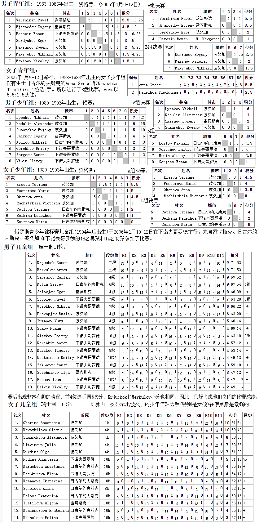 俄罗斯N.诺夫哥罗德公开赛/第十五届青少年赛 时间:2006-04-30 15:35 来源:本站原创 作者:佚名 点击:次 俄罗斯下诺夫哥罗德公开赛 为纪念下诺夫哥罗德连珠俱乐部成立22周年,俄罗斯下诺夫哥罗德公开赛于2006年3月17-19日举行。共有20位棋手参加了比赛,瑞士制8轮。 第十五届俄罗斯青少年连珠锦标赛 第15届俄罗斯连珠青少年锦标赛于2006年3月26-31日在雷宾斯克举办。 (责任编辑:伍源)