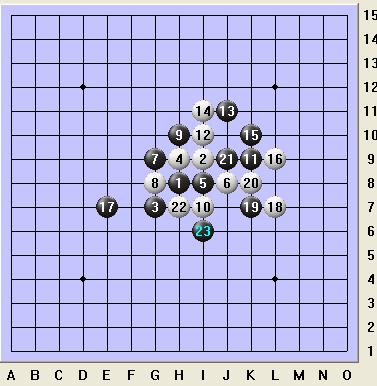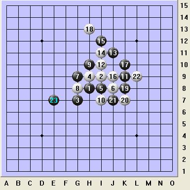 现在看实战15的走法,看似是凶悍的进攻,但因为无视了冲四,局势并不明朗。如图中白16冲掉,18再防,22后,黑优势并不明显。
