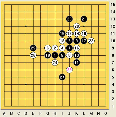 中山执黑,疏星开局,没交换,2打,之后的行棋走的都是很常见的走法,13手出现的变化有好几种,比如I10,J7,K8等,中山智晴很快的走了较早出现的走法K8,黑棋经过一系列平稳的交换后,可以放心的转身到下方或者左上角去进攻,