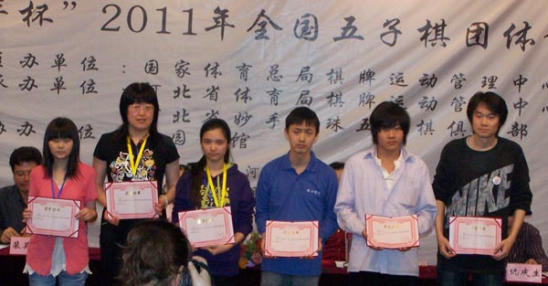 2011年全国五子棋团体锦标赛5月2日中午在石家庄颐园宾馆落幕,男子36个队(108人)、女子14个队(42人)分别进行了九轮及七轮的争夺。最后炫飞2队夺得男子冠军,湖北女队夺得女子冠军。