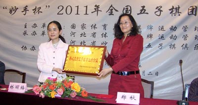 林丽梅向郑秋颁发热心支持五子棋事业奖