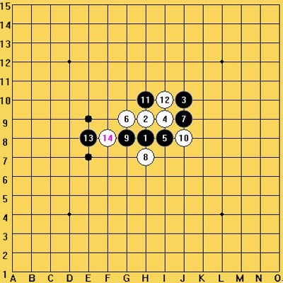 我对首都师范的人也算比较熟悉了,对手去年是参加无禁组的比赛,平时在网上玩过也对他的实力有一定了解,计算大局观什么的还不错,但谱量是硬伤。我不知道为什么对手开了我最擅长的疏星局,也许是对别的开局定式不甚了解?一开始曾想交换过来主导变化以求一击打倒对手,但思考过后还是觉得对手既然敢开疏星,必然是有备而来,我就执白以静制动他也不能拿我怎么样。对手给出1,2打再次让我意外,难道因为对手看了《方寸之间》中提到的,对手看起来最强的地方往往就是他的短板(原话咋说的我忘了)?曾经想过6手就变招,但意识到自己对那个6后续的变化还不是那么熟悉,就走了最正常的6,7定式,8果断变招,此时若再不变后续定式由黑棋主导,黑白将进入漫长的中盘阶段,上轮下成那样我可不想再经历一次。果然对手对这个8不甚熟悉,陷入长考之后还是选择了活三,大多数人第一次见到这个盘面也是这么走的。12定式,13疑问手!白14挡之后15无论是E7还是E9都不舒服。