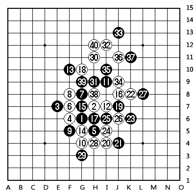 偏两路盘端通疏星,这个打点习惯上我也是倾向于执白的,但我忽然想起了实战中至黑15的变化,之前在网上下的时候不是很熟悉,即使按照原来的盘端,如果不了解相关研究的话要想稳妥防御下来也要费不少精力,现在还多出了空间,我便立刻决定从这个走法进行突破。24强行送长连定型,但白26还是不慎必败。由于空间和材料连接等诸多原因,即使白棋在局部防御成功黑棋也不至于崩溃,可以说这盘是稳固的胜利。