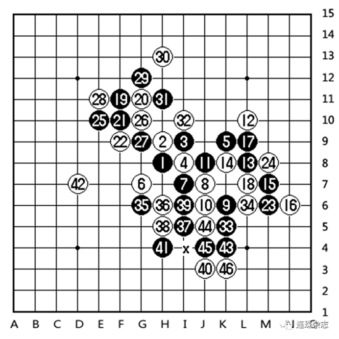 42直接在左边做棋,黑43如果在右边活三,那么白棋可以冲四,迫使黑棋形成四四禁手无法取胜。