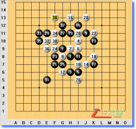 这是当天下午的第二轮的比赛,由对手开局,对手开的斜月。在2000年以前斜月一直被认为是平衡局,2000年以后有人研究出来斜月是黑优的,所以我选择了交换。16手之前都是定式,如果按定式黑17应该在K8落子,因为那个定式是白优的定式,所以我17手在长考之后选择的先在L6点跳3,白18按常理中间打断,黑19在J7点继续形成跳三,这时对手并没有急于落子,在考虑之后,白20走了一步妙手,堵在了跳三的上端,这是我没有算到的,因为想到前面的棋全都白算了,所以心理有点反映!黑21走在了K5点,这点是个低级错误,这点落下后,白可以走H4,I5点这样就能成功抓住黑棋在J6点的四四禁手!幸好这位北京选手跟我一样年轻并没多看,直接防住了我在J6点的四四禁手点!真是大难不死啊!23手挡在了I5点防住了白方的一个四三,其实23手如果在24那点防守会更好,以下黑方随曾多步扩展,无奈白棋步步强防,36手落下双方都没有任何机会,因此双方议和!