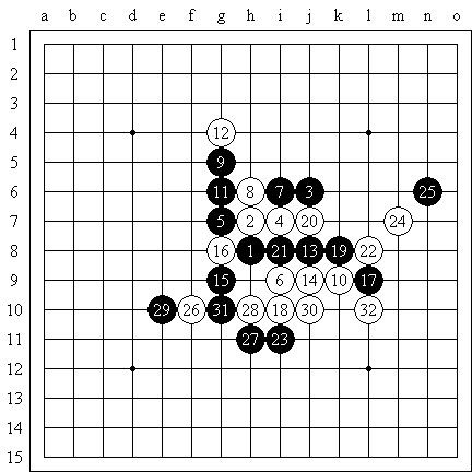 黑7活三是莫名奇妙的手段,黑9之后才发现7-9还原为疏星局黑优(胜?)一型(有盘端问题),顿时懊悔不已。白10是老实而有效的手段,黑11把握局势立刻开始控制外围,12弱?14逆止也并无大大碍,16-j10唯一,实战16弱防后黑简单胜。