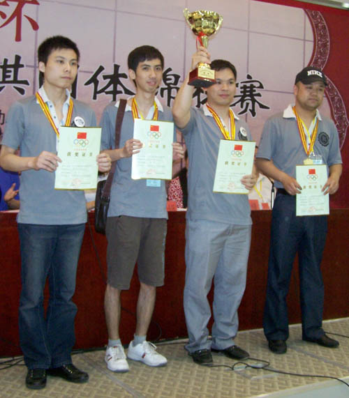 左起徐炳继、郑秋、夏金娟、林丽梅、仇庆生 冠军:炫飞2队--谭鑫麟/黄立勤/贺启发/梁大伟 亚军:上海1队-顾炜/朱建锋/葛凌峰/张轶峰 季军:北京队-仇云飞/曹冬/李一/李鹏