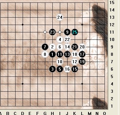 26手这里有2个选择:I11先冲断或在G11活斜2直接控制,但后来网络高手基本认为G11最强,更具有攻击性,没有彻底阻断23 9 25手组成的跳眠3,因为由于白的牵制,黑在右上方暂时无法直接进攻。同时,26与24形成新的活2,奠定了左上方白的优势。这样的棋必须把所有变化都参透才能确信这手棋的强大。如果26=I11,那么后边的较强变化如图: