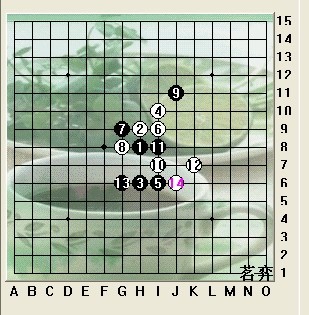 瑞星开局,前14手双方应对无误,如果白14反向防守将速败,有两种杀法,以下两个15黑都必胜了: