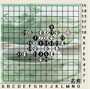 一般情况下,双方会按定式走完31手,这就是著名的瑞星大定式,据研究32手只有以下两点可选择,其他的点黑都能必胜。32手以后随然是黑优,但没有必胜,双方可能和棋。