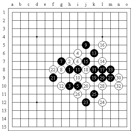 RIF规则。和我赛前设想的一样,王硕的棋走得稍微死板,缺乏创意,也就难以造成取胜的机会。20-21我认为是更好的手段,21后,前天晚上我在网上见到了22-f6的变化,简单拆了拆发现很有味道。实战中的22把机会完全留给了黑棋。23-k12或许也是不错的变化,实战23-23则是为了保留向左发展的机会,24大恶手!这就好像一个初学禁手的棋手为了造出长连而刻意走出的手段,但在长连之前,25首先是成两个活二的好点,如此24实在不堪。事实上,最后我的取胜也恰恰是充分利用了这个特殊的长连形状。实际上,27以下的胜法好像稍有问题,但刚刚拆解后发现26确实是必败的一手,有兴趣的朋友可以再自己研究一下。