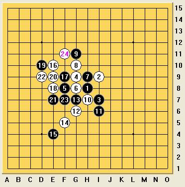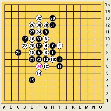 实战19手意图显然是解禁兼防守,由于这是我第一次用这个定式并且实战19手与今年名人战第二盘已经不同,故此时我便开始面对陌生局面。经过短时间的考虑,我选择了20手至24手的交换方式,以一个活三虚盖住对手的活三,继续掌握局面的主动权。