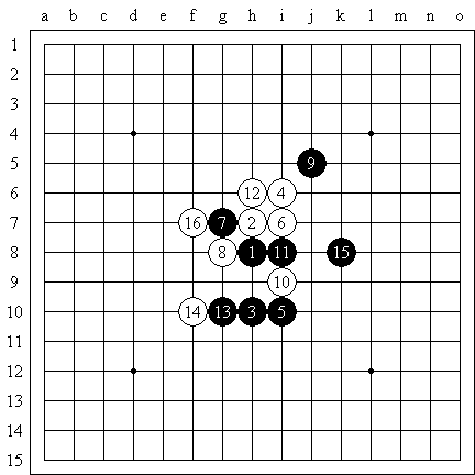 幸运的一局。12后手策略,预计13-23,14-13,16-15,17-g10,18-f11,未料想实战13-13同样很强!想要抓住机会只能避免14-15的同形必败,但15-15后却是另一套黑棋必胜变化。绝望之下只得用反击来寻求机会。23先行处理的一手消除白棋材料,但就在这时我似乎意识到了黑棋的一点点漏洞——而那漏洞竟演变成了事实——没有防守之后的反击,只有转瞬之间的胜负易手:25、26交换后,自然的后续忽然变成了“四四”禁手,简直是不可思议的强运!