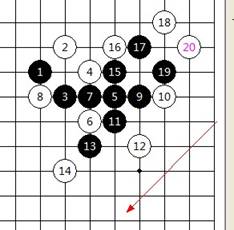 图中黑5应变,与其说是进攻,倒不如说是向外游走。借着上面虚连接和对白子的控制作用,黑棋将来能逐步向棋盘中央发展并形成优势。