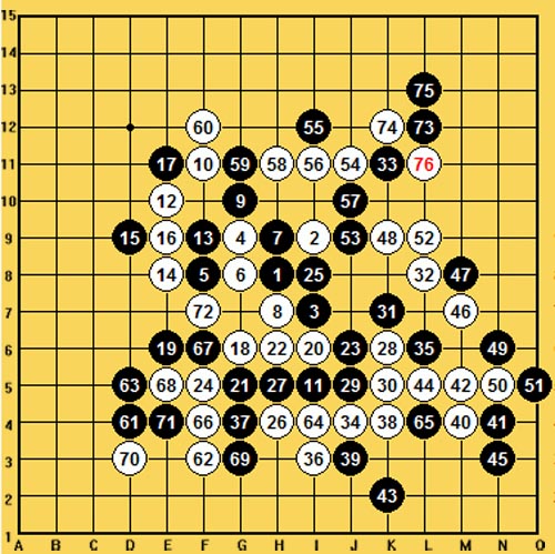 这是4分之一决赛(8进4)的对局,我对B组第4朱建峰,基本同一时代的棋手,都下了10多年棋了,彼此很熟悉了解。他开出蒲月叫6打,后来他告诉我是临场想的,是看了女子组那边有开这个的。实际选的变化他说是受了预赛的启发。我没有交换执白应对,实战留下的这个打点公认的黑白很平衡的打点,一直到白10为常见流行定式,黑11做双跳2变招,其实也不能说是变招了,日本名人赛已经出现过这种下法了,网上应该也是早就有过,实战的12,14的下法,是我早就知道的,但后面结论到底谁更好不好说。14后黑棋是没有胜的,白棋两个活2形成牵制,黑15还可下在e9(我个人认为e9可能更好)。实战白18后白看似很主动,但黑下方的棋也不薄,白想攻死也难,黑19选择了最保险的防守方法,但感觉黑想赢下这盘也难了。实战20我还考虑了j6的下法,但没有采用是因为感觉给大方压力不够大,但事后分析j6更好,一防守稳健,二是对外围控制有利。不管下哪个,黑21都是抢实战这个点好。22我想了很久,没发现太好的攻击方法,先手可能会保不住,但当时考虑这盘和棋就可以,选择了稳健的下法,白22到白32双方正常的攻防,到32自己还是比较满意的,确定的是这盘应该至少不会输。黑33飘在上方很远的地方,可以说是拼命了,这里我想如果直接过去单防太被动了,仔细计算发现33后黑上方无法做出vcf,所以实战34果断托先在上方进攻,即便攻不死,期望能借出来一些东西。35选择把狭小的上方给黑棋是对的,白36继续做棋,但下完我发现下h2做跳眠3似乎更好,因为那样的话,黑也是只能防实战的37。实战37,39防的都很精彩,但白棋借东西的计划是可以实现了,黑41唯一,否则有抓33的手段,43防的也很巧,白棋无杀。后面白试图往上面借,实战黑47其实已经死了,白有个巧妙胜,有兴趣的朋友可以看看。但当时时间太紧了,没有仔细去计算。实战一直交换到52自己还是满意的,先手下到了上方黑有些优势的地方,但由于白棋借出一些棋型,黑上方仅存优势也就没了,此后继续稳扎稳打,因为和棋就能出现,所以没太考虑进攻了,白76后黑已经空间进攻了,最后无奈和棋。精彩和艰苦的一盘对局,好在结果不错,进入4强。